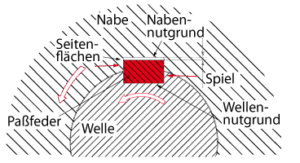Eine Passfederverbindung wird zur Realisierung einer Welle-Nabe-Verbindung genutzt (siehe Bild). Sie ist die überwiegend gebräuchlichste Formschlussverbindung für Riemenscheiben, Zahnräder und Kupplungen mit Wellen bei vorwiegend einseitigen Drehmomentbelastungen. Diese Art der Verbindung ist preiswert, einfach zu montieren und läßt sich leicht lösen. Die in der Wellen- und Nabennut sitzende, als Mitnehmer wirkende Passfeder trägt, im Gegensatz zur baulich ähnlichen Nuten-Keilverbindung, nur mit ihren Seitenflächen, die Rückenfläche besitzt etwas Spiel. Passfederverbindungen sind reine Mitnehmerverbindungen. Im Gegensatz zur Keilverbindung werden hier die Teile nicht gegeneinander verspannt. Zwischen Passfeder und Nabennutgrund muß immer Spiel vorhanden sein (siehe Bild). Die parallelen Seitenflächen der Passfeder liegen an den Seitenflächen von der Wellen- und Nabennut an und übertragen so das Drehmoment zwischen Welle und Nabe durch Formschluss. Die Beanspruchung der Passfeder unterliegt erfolgt dabei durch Flächenpressung und Scherung. Um die zulässigen Festigkeitswerte nicht zu überschreiben, sollte die Passfederlänge mindestens 1,2 mal des Wellendurchmessers betragen.